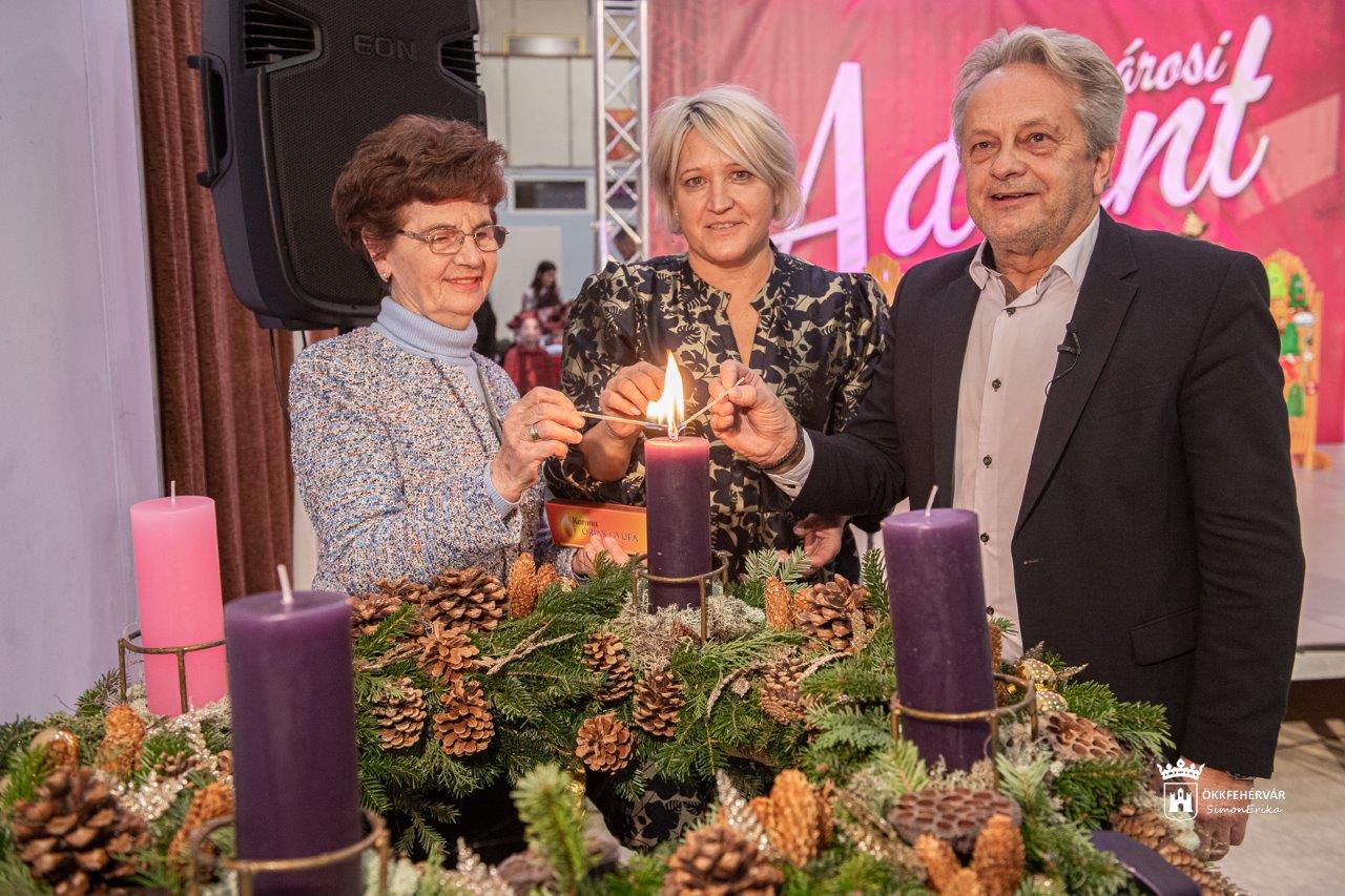 Dr. Horváth Miklósné, Deák Lajosné és Vargha Tamás közösen gyújtották meg az adventi koszorún az első gyertyát.